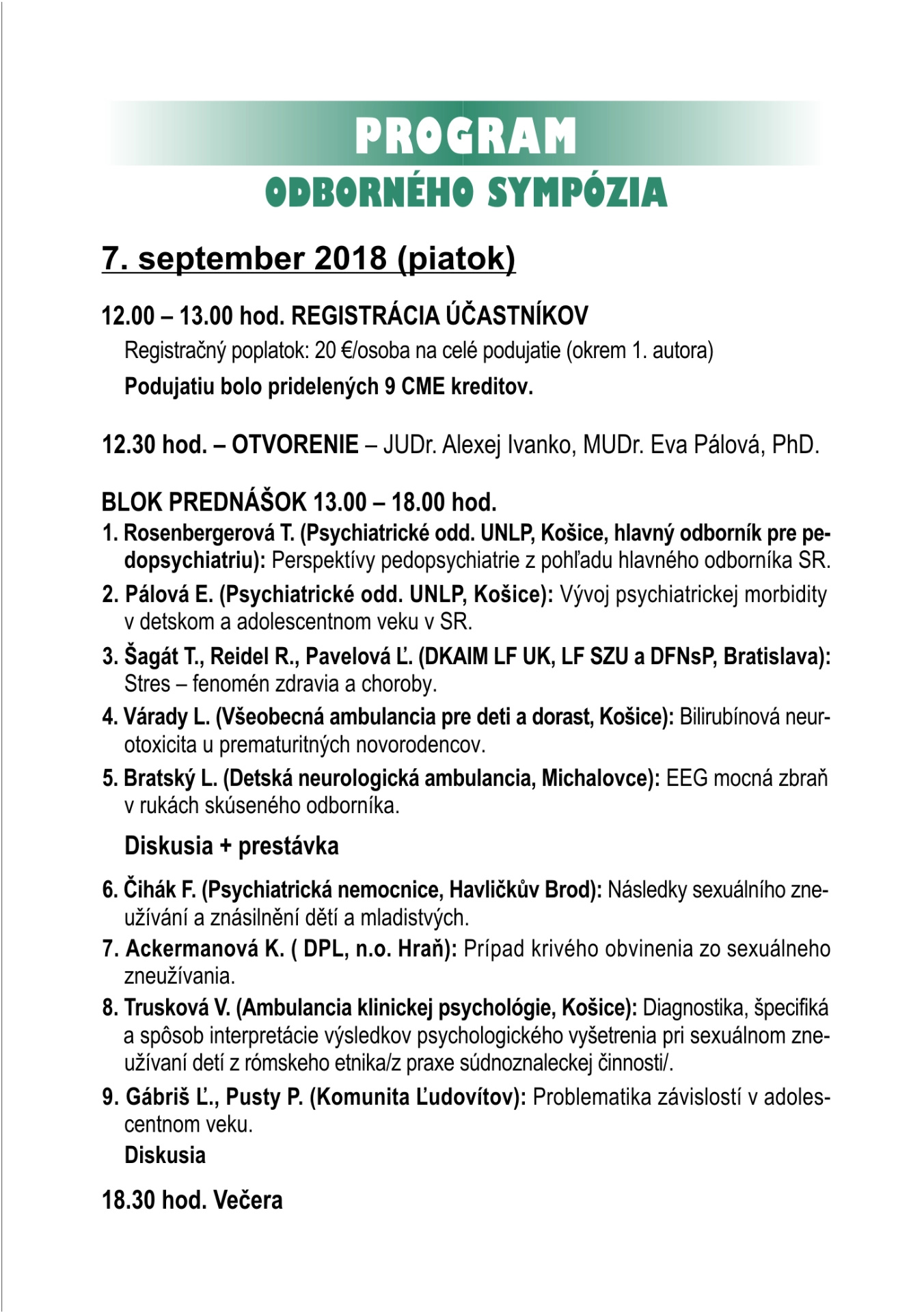 Detská psychiatrická liečebňa, n.o. v Hrani v spolupráci s Psychiatrickým oddelením UNLP v Košiciach Vás srdečne pozýva na odborné sympózium, ktoré sa uskutoční v priestoroch DPL Hraň v dňoch 7-8.9.2018. Odborný garant podujatia: MUDr. Eva Pálová, PhD.